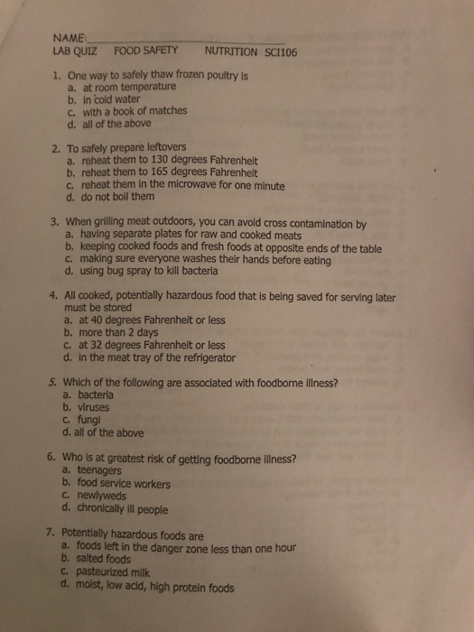 Solved Name Lab Quiz Food Safety Nutrition Sci106 1 One